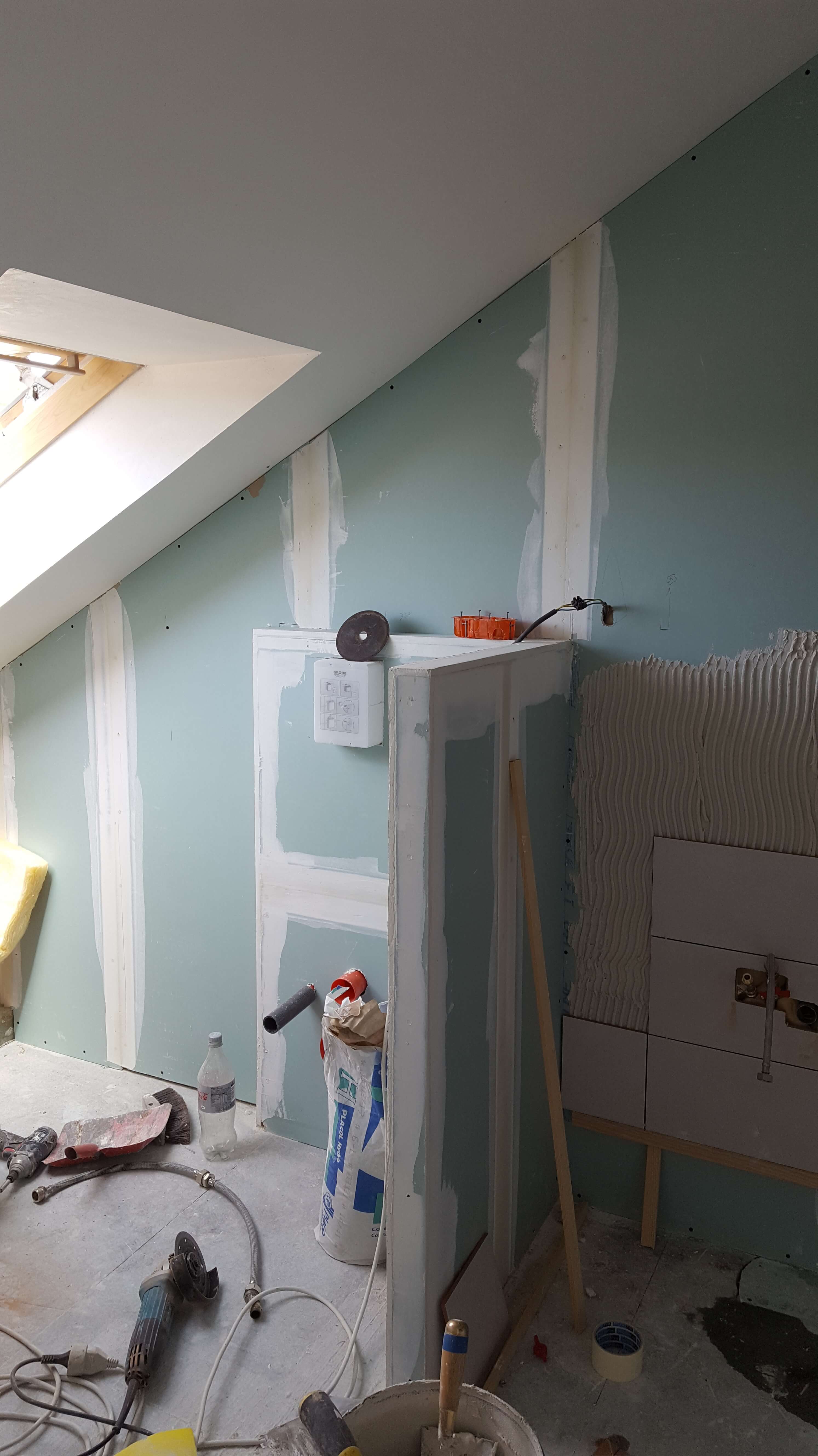 Renovación de baño con instalación de: fontanería, evacuaciones, electricidad, montajes de inodoro suspendido, sanitarios y grifería; Alicatado de muros, suelos y pintura.