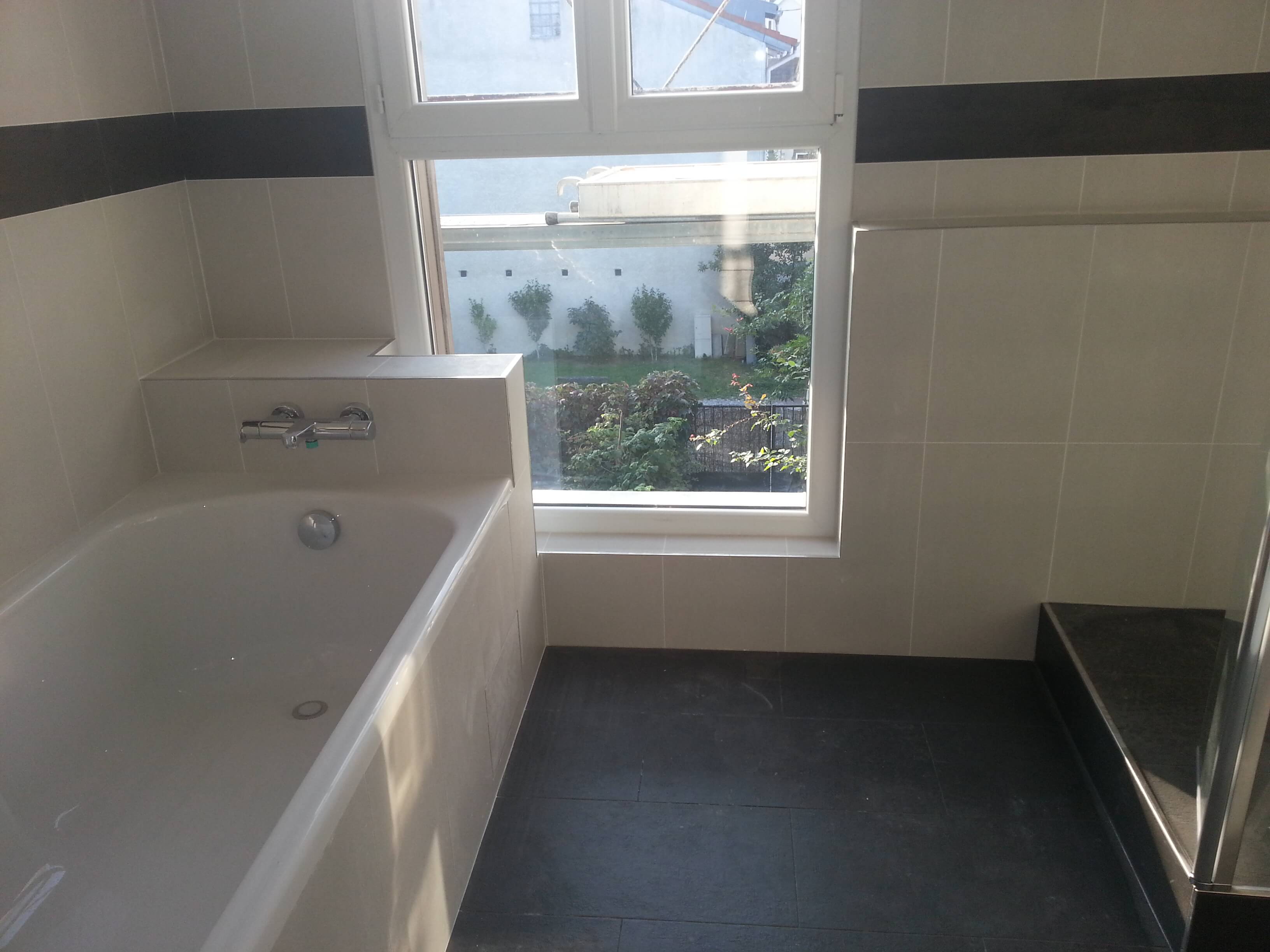 Demolición e instalaciones de : fontanería, electricidad, evacuaciones; muros en BA13 ( PLACOSTYL HYDRO ), muros y suelos en azulejos beige y negro (Gres porcelánico), ducha a la italiana y bañera en porcelana; griferia de decoración, ventana PVC blanco a medida “Climalit”.
