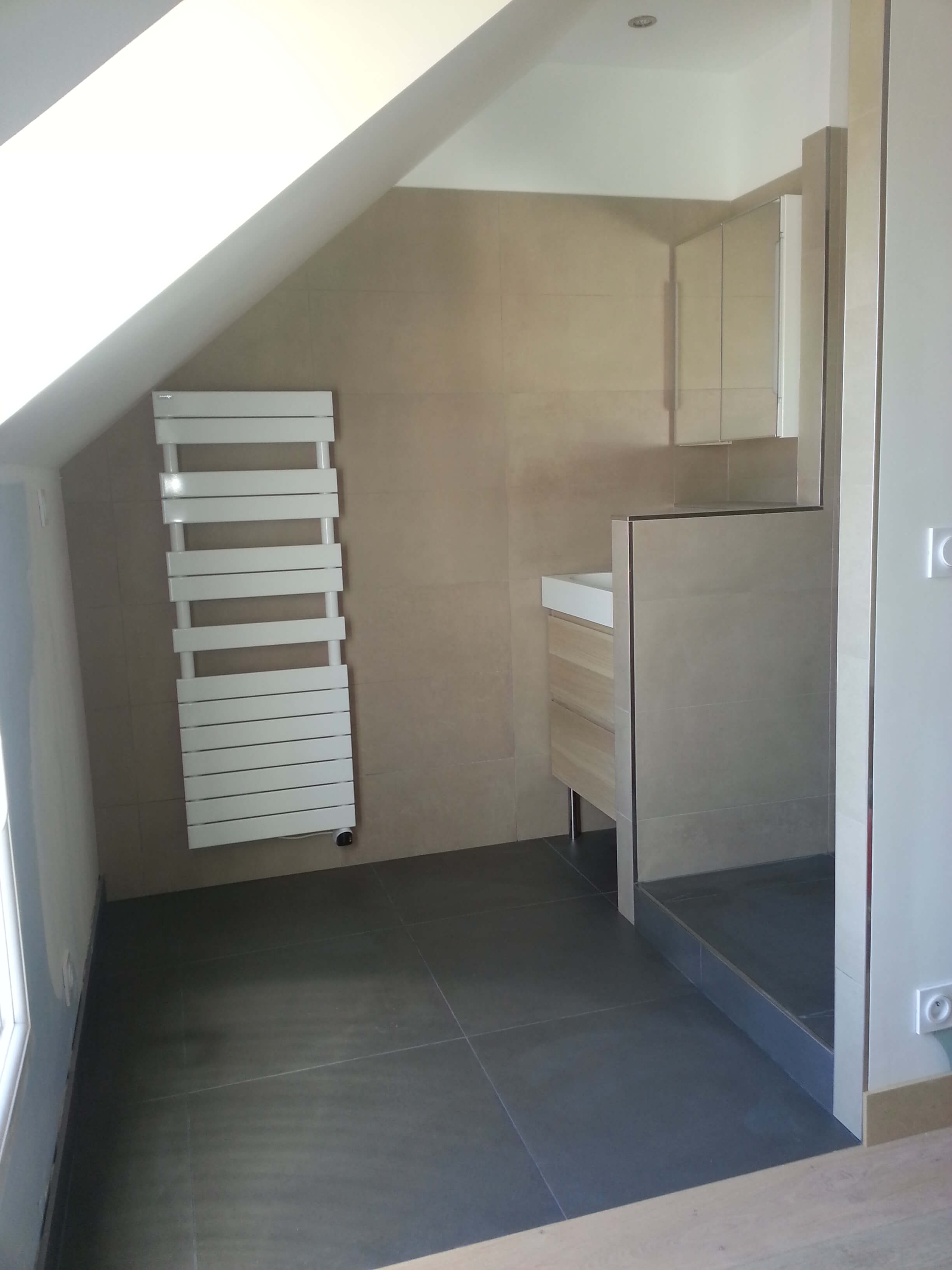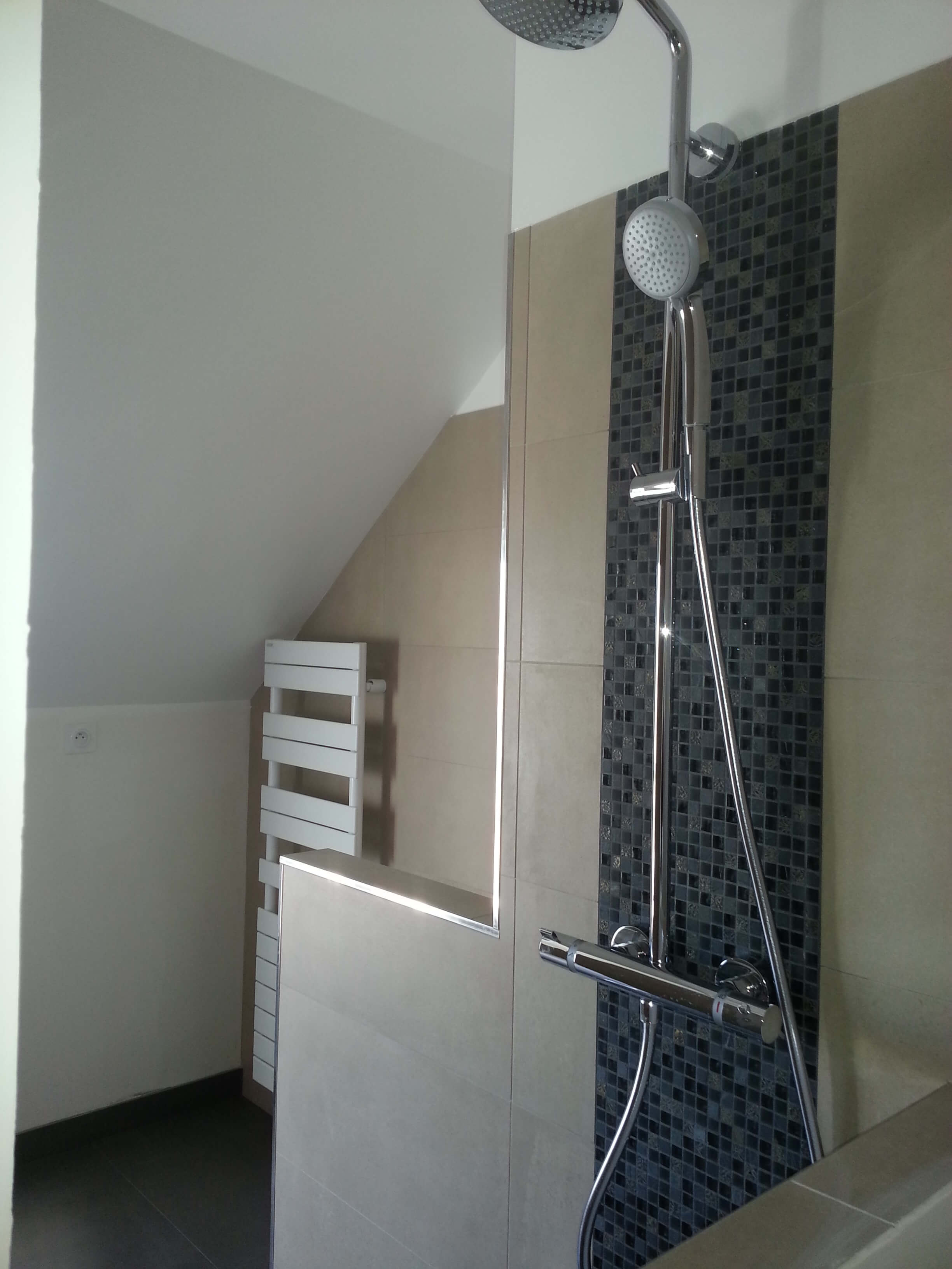 instalaciones de : fontanería (cobre), evacuaciones y electricidad; muros en BA13 (PLACOSTYL HIDRO ), ducha a la italiana con un muro decorativo en mosaico ( gresite negro), suelos y muros en azulejos beige y negro ( gres pocelanico ), radiador eléctrico, lavamanos ( vasca y muebles en madera ) y griferia decorativa.